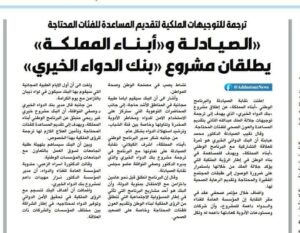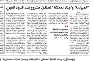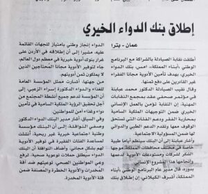 لصحف الورقية ” الرأي ، الغد ، الدستور ” تنشر في أعدادها هذا اليوم خبر إطلاق البرنامج الوطني ” أبناء المملكة ” ونقابة الصيادلة ، لمشروع ” بنك الدواء الخيري ” من خلال مؤتمر صحفي عُقد يوم أمس في مجمع النقابات المهنية .
