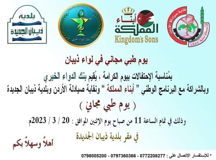 بمناسبة يوم الكرامة ، يُقيم ” بنك الدواء الخيري ” وبالشراكة مع البرنامج الوطني ” أبناء المملكة ” ، ونقابة الصيادلة ، وبلدية ذيبان الكبرى ، وبالتعاون مع المؤسسة العامة للغذاء والدواء ، ومديرية صحة مأدبا ؛ ( يوم طبي مجاني ) في لواء ذيبان / محافظة مأدبا / قاعة البلدية ، حيث سيتم خلال هذا اليوم الطبي المجاني ؛ عمل فحوصات طبية ، وتقديم الأدوية المناسبة بشكل مجاني ، وكل ذلك تحت إشراف كادر طبي وصيدلاني متخصص .