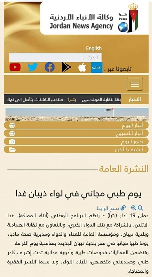 عمان 19 آذار (بترا) – ينظم البرنامج الوطني (أبناء المملكة)، غدا الاثنين، بالشراكة مع بنك الدواء الخيري، وبالتعاون مع نقابة الصيادلة وبلدية ذيبان، ومؤسسة العامة للغذاء والدواء ومديرية صحة مادبا، يوما طبيا مجانيا في مقر بلدية ذيبان الجديدة بمناسبة يوم الكرامة.