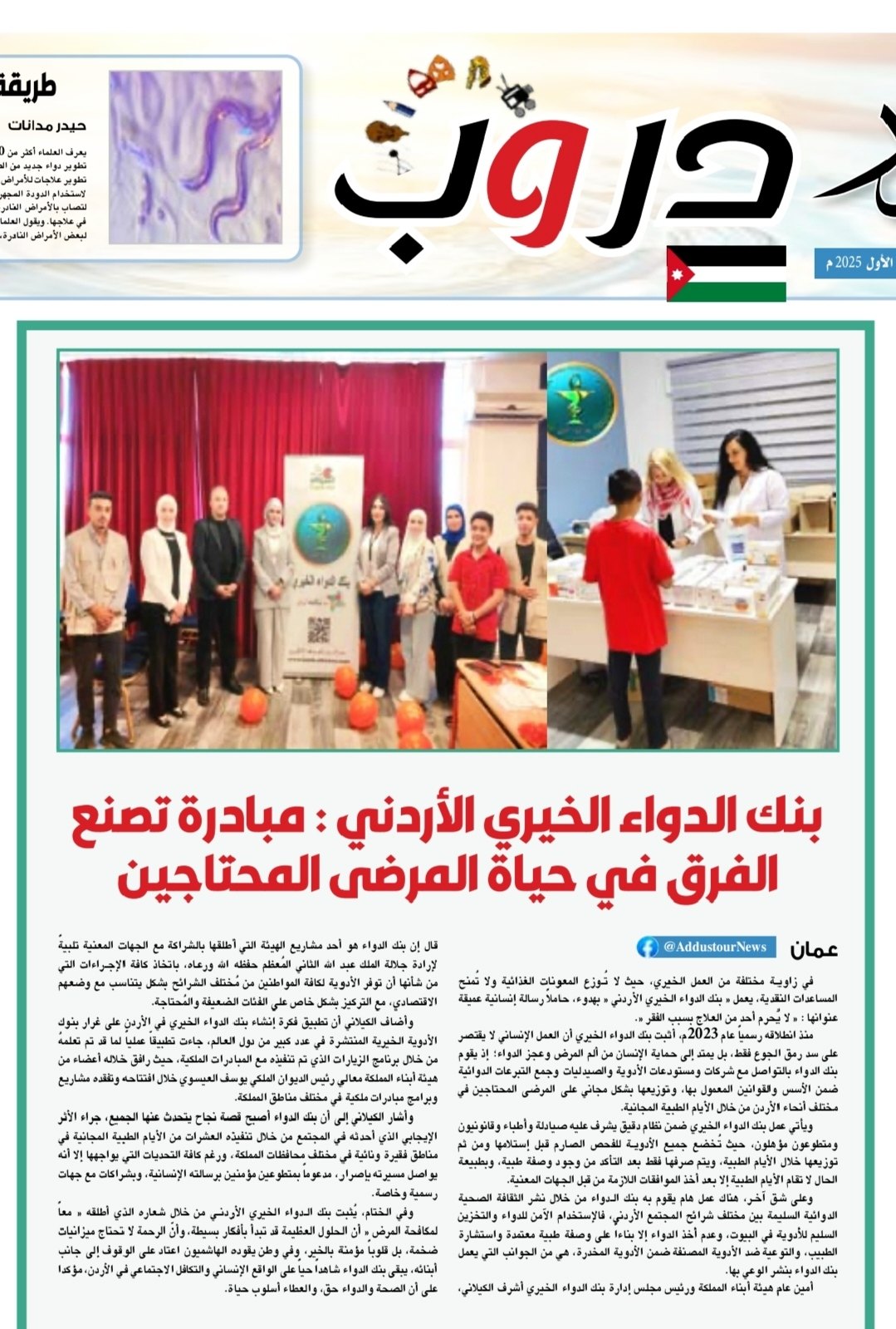 نشرت صحيفة «الدستور» في عددها الصادر اليوم تقريرًا صحفيًا سلّط الضوء على تجربة بنك الدواء الخيري الأردني، بعنوان: «بنك الدواء الخيري الأردني… مبادرة تصنع الفرق في حياة المرضى المحتاجين».