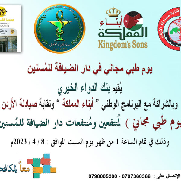 بعون الله ورعايته ، يُنظم ” بنك الدواء الخيري ” يوماً طبياً مجانياً في دار الضيافة للمُسنين ... اقرأ أكثر